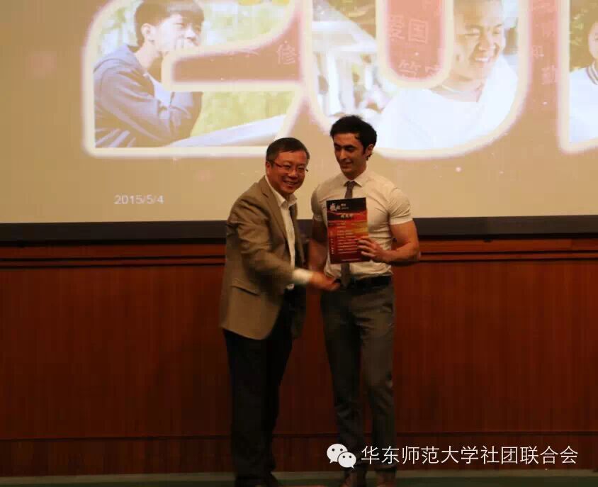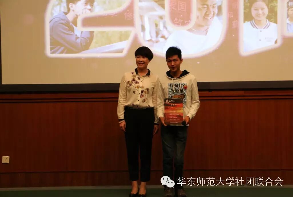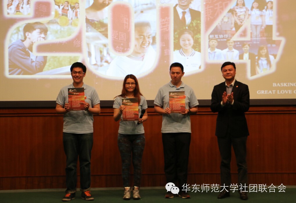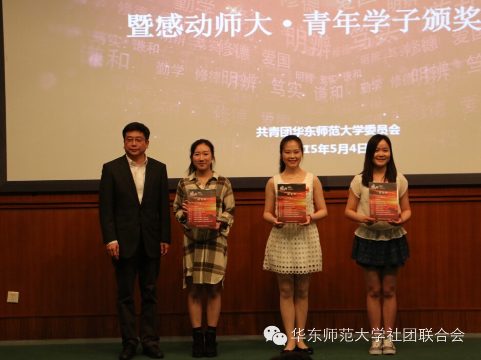 2015年5月4日,由华东师范大学校团委主办,校社团联合会承办的华东师范大学2013-2014年度“五四”表彰大会暨“感动师大·青年学子”2014颁奖典礼在中山北路校区逸夫楼报告厅隆重举行。华东师范大学校友、原上海师范大学校长杨德广、团市委副书记刘刚、校党委书记童世骏、校长陈群、校党委常务副书记曹文泽、校党委副书记、副校长任友群、副校长郭为禄、副校长孙真荣出席了本次典礼,学工党委、党委宣传部、对外联络处、教务处、社科处、科技处、人事处、国际教育中心等相关职能部门负责人、各院系分管学生工作党委副书记及团委书记参加了这次活动。