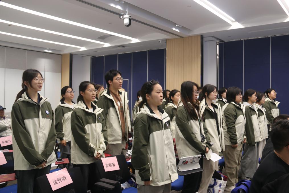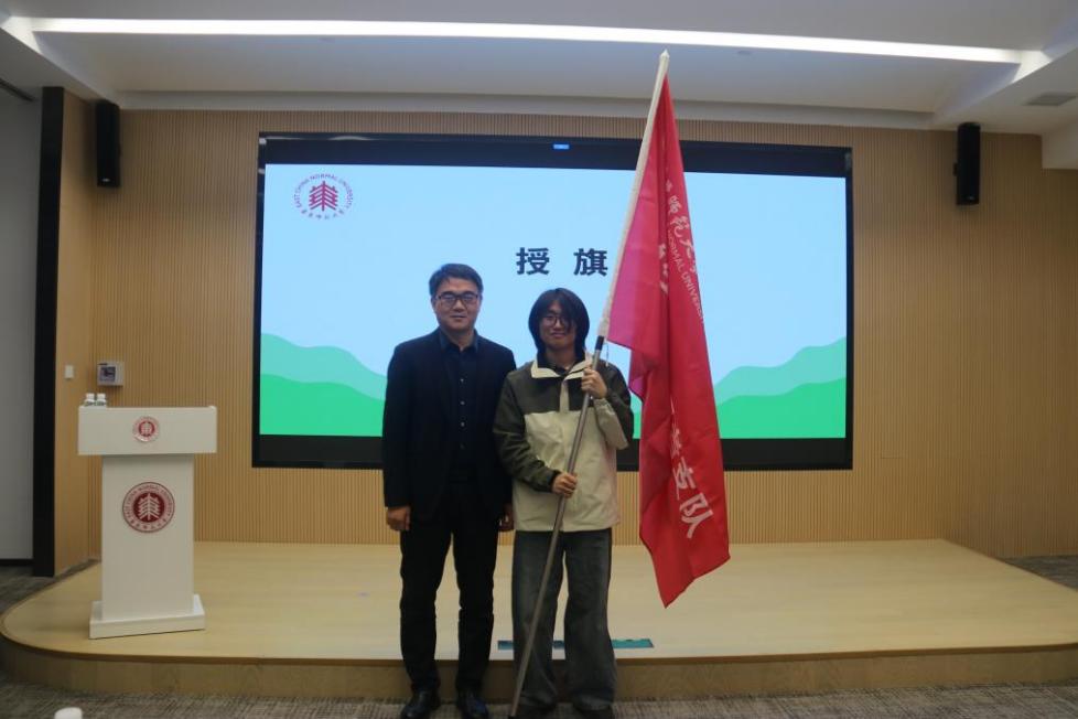 在全场人员的共同见证下,上海市大学生平安志愿者总队负责人王国正为支队授旗,志愿者队长金哲皓郑重接旗,标志着华东师范大学大学生平安志愿者支队正式成立。随后,全体志愿者起立,在领誓人的带领下庄严宣誓,铿锵有力的誓言响彻会场,许下了以青春之力守护校园平安的坚定承诺。