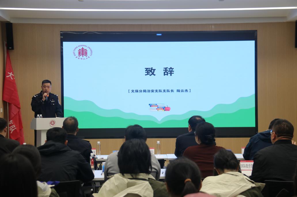 仪式伊始,上海市文保分局治安支队支队长陆云杰致辞。他代表分局治安支队,对华东师范大学大学生平安志愿者支队的正式成立表示热烈祝贺。他指出,校园安全是社会安全的重要基石,大学生是平安建设的生力军。成立平安志愿者队伍,既是高校落实安全主体责任的务实举措,也是青年学子参与社会治理、践行责任担当的重要平台。他希望全体志愿者牢记志愿初心、强化安全素养、严守服务规范、发挥青年优势,主动参与、积极作为,展现师大学子良好风貌,用青春力量筑牢校园安全防线。他表示,分局将一如既往支持学校平安建设工作,与学校携手联动、密切配合,共同守护校园安全。